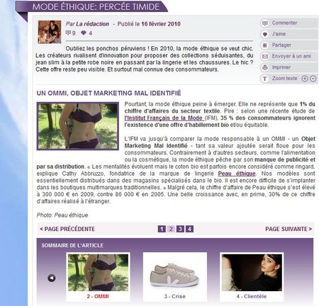 C. A. BIO a fait l’objet d’exemple de ce phénomène d’OMMI dans le webmagazine féminin Terra Femina avec le témoignage de sa créatrice, Cathy Abruzzo. Elle explique la problématique de la mode éthique encore peu ou mal connue, l’enjeu de se faire connaître auprès de consommateurs non avertis… De plus, au niveau de la distribution, nous avons beaucoup de mal à pénétrer des canaux de distributions comme les boutiques de lingerie multimarques…. Nous, on attend que ça d’être distribué aux galeries Lafayette… aux cotés de marques prestigieuses….